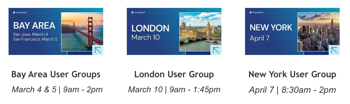 Join our upcoming User Groups to hear about our product roadmap, learn ideas you can apply immediately to your own planning, and make new connections with your local Pigment Community.