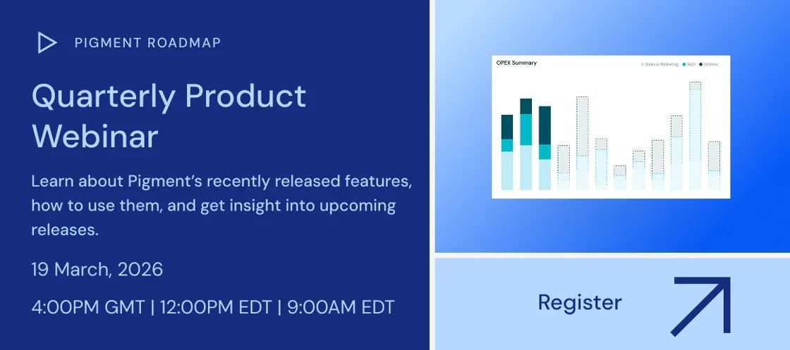 Join us March 19th at 4pm GMT for our exclusive webinar, designed just for our customers and partners, where we dive into the latest and greatest features in Pigment. This is your chance to get a first look at our product roadmap, connect with peers, and discuss the topics that matter to you.