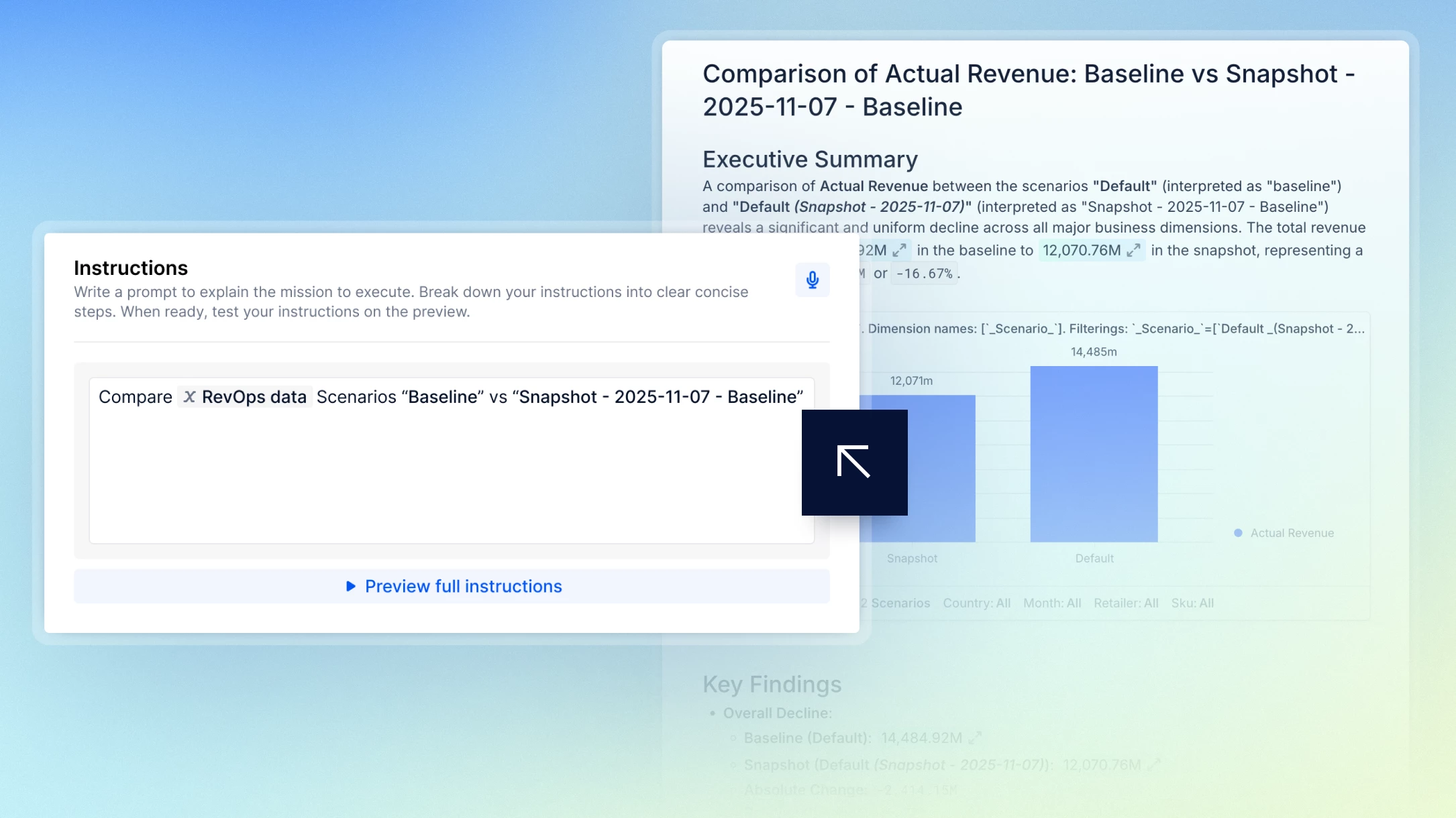 The Analyst Agent can now seamlessly access and analyze data from Snapshots! This means you can directly compare live Application data against historical Snapshots within your analyses. To access Snapshots, make sure native Scenarios are activated in your Workspace, then reference the Snapshots as shown in the docs.