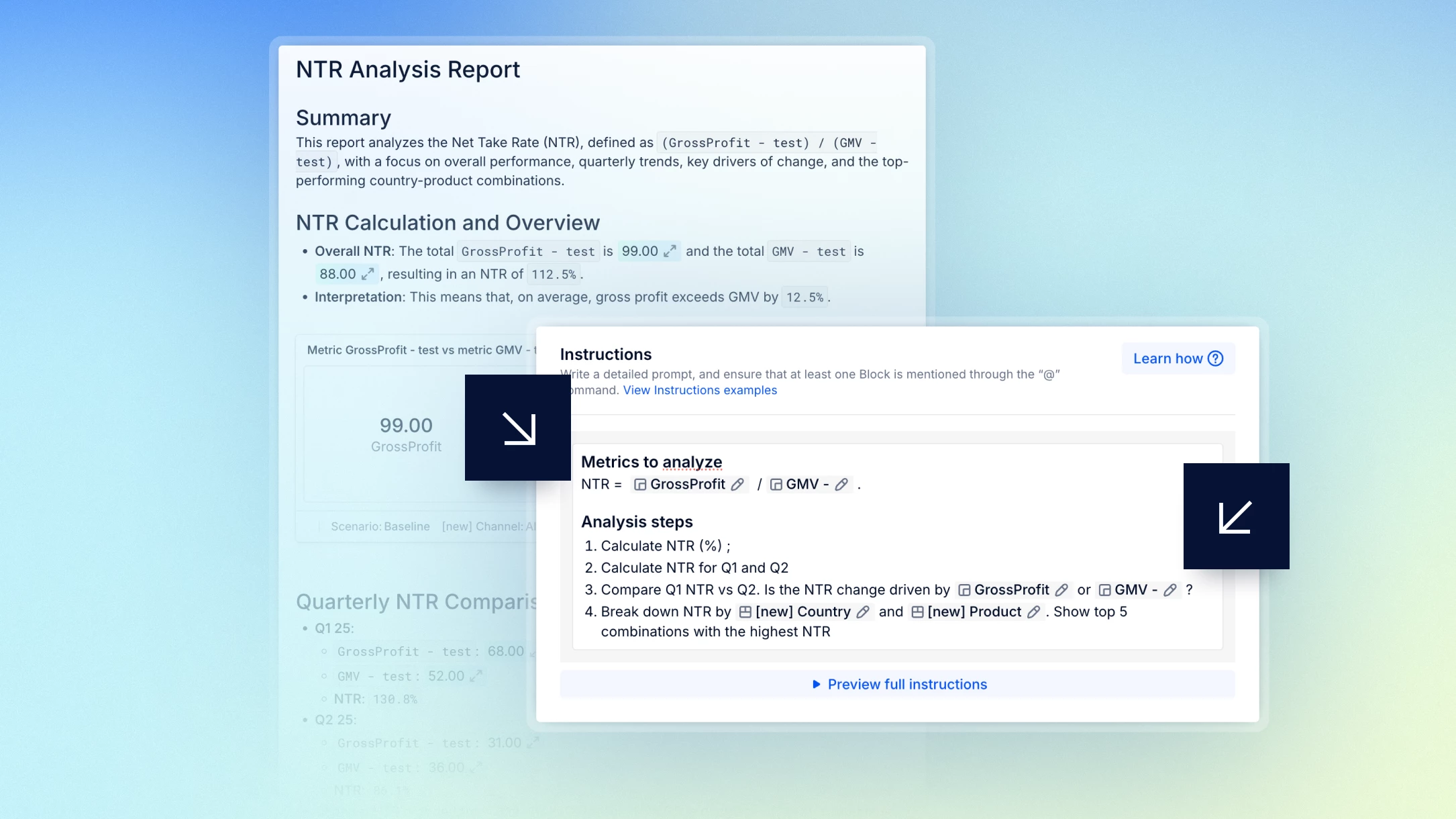 Compare different Metrics directly in your analyses! Unlock new calculations like Absolute differences (e.g. “Compare Quota vs Target”), Ratios (e.g. “Calculate NTR = Gross Profit / GMV”), and Growth calculations (e.g. “Show Gross Profit as a % of Revenue”). Remember, when working with ratios, prompt with “top items with the highest ratio,” not “top contributors.”