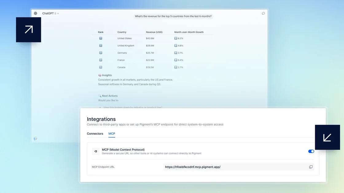 Pigment's MCP Server is the secure, open-standard way for AI platforms like ChatGPT to access Pigment planning data and logic. Let these platforms analyze performance, compare actuals to budget, or run Pigment agents (coming soon), through the same data model and business logic you already use. With support for more LLMs on the way, be part of the very first EPM provider offering this capability.