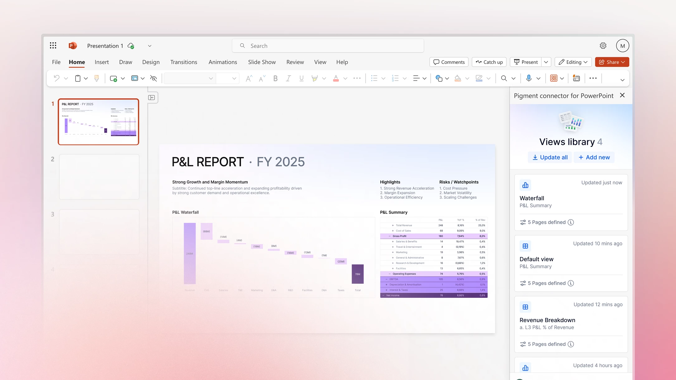 With the new Pigment Connector for PowerPoint Add-in, you can seamlessly insert Pigment charts and grids into slides while preserving formatting and maintaining live data connections. Refresh a single View or an entire deck in one click to keep numbers accurate as data changes. Bring real-time Pigment insights into every presentation—now available on the Microsoft App Marketplace. Learn more.