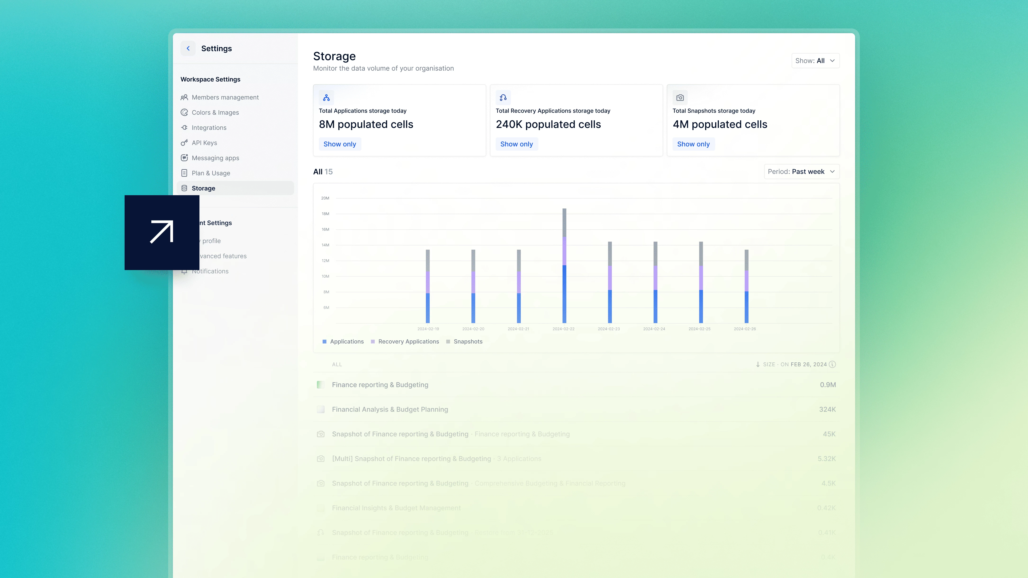 You can now leverage a consolidated, real-time view of populated cell volume across all Applications, Recovered Applications, and Snapshots using the Storage page. Quickly monitor storage trends, spot unexpected increases, and understand where usage is concentrated. It’s a faster, clearer way to maintain healthy Workspace hygiene and support more informed modeling decisions.