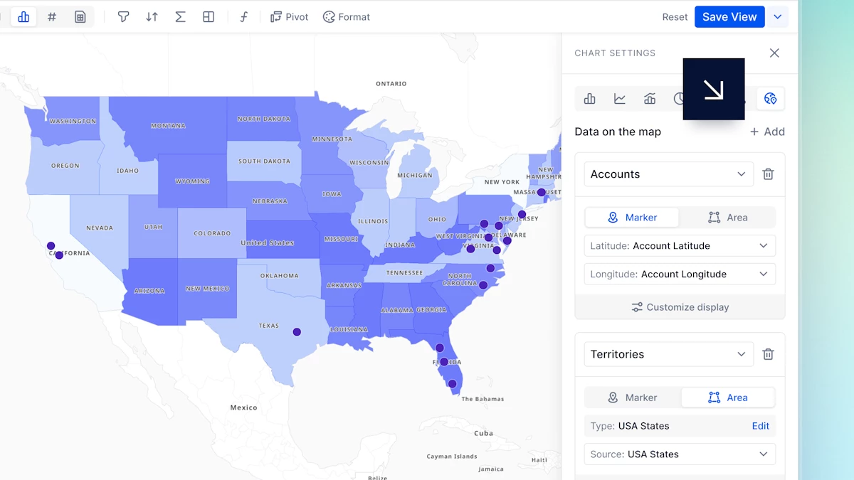 Multi-layer Map charts are now live, making it easy to combine markers and areas in a single View for richer geographic insight. You can overlay multiple datasets or geographic layers, such as sales territories with account markers, and customize each layer’s colors, Metrics, and display options to visualize relationships clearly in one place. Learn more.
