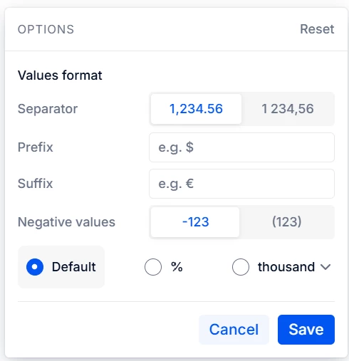 Negative values - Specify if negative numbers are formatted with parenthesis instead of the minus symbol.