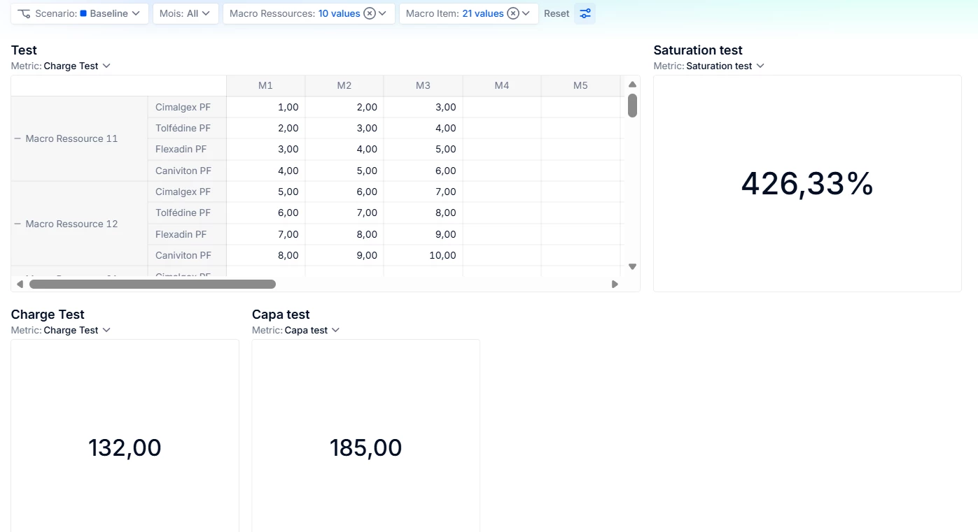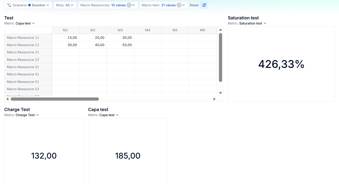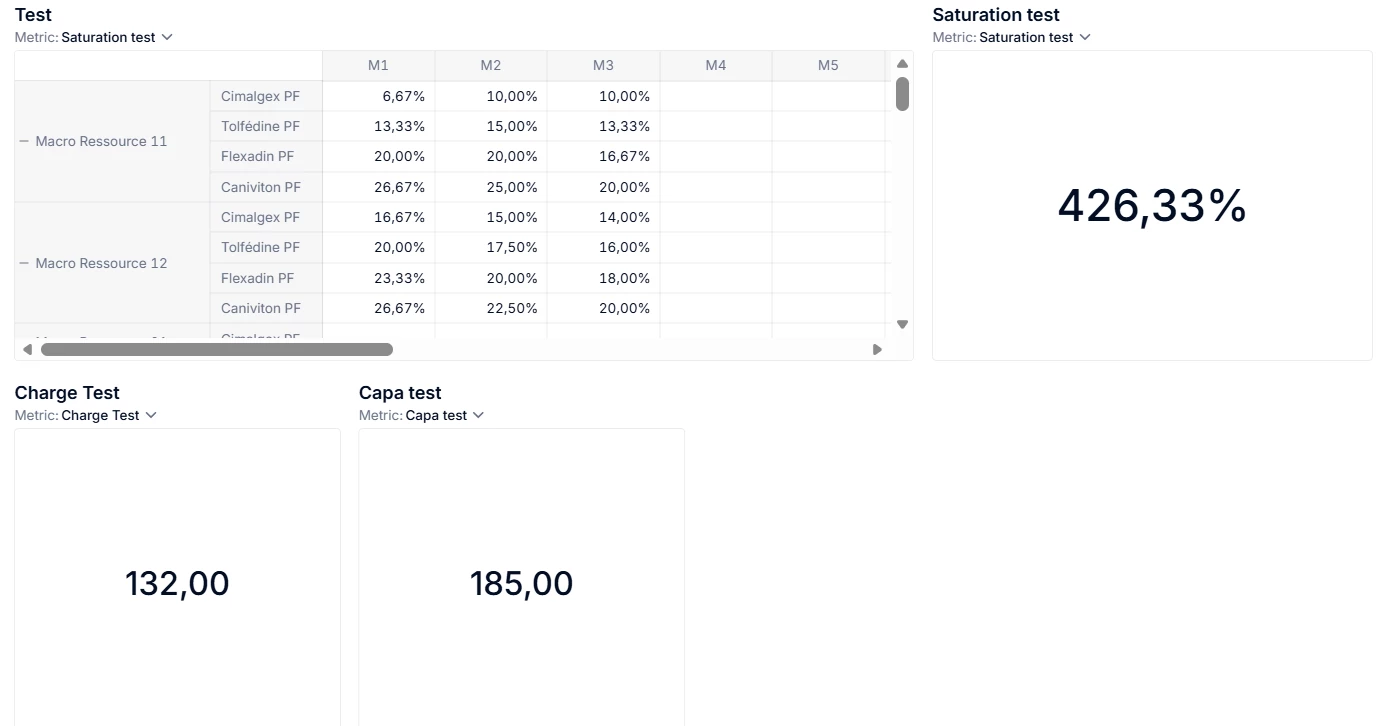 - Saturation Test (Dimensions: Macro Ressources, Macro Item, Mois) : Saturation Test = Capa Test / Charge Test
