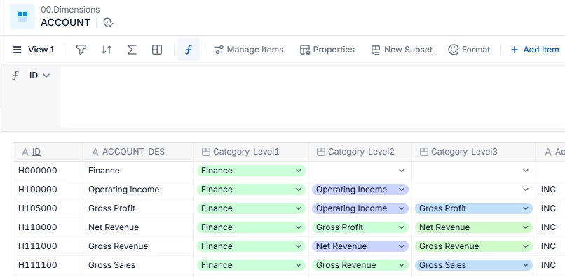 In my Transactional list, I don't have any lines corresponding to the Parent value "Finance," and for "INC" type accounts, only Gross Sales returns values. However, I would like to display all accounts as shown in the attached chart of accounts: