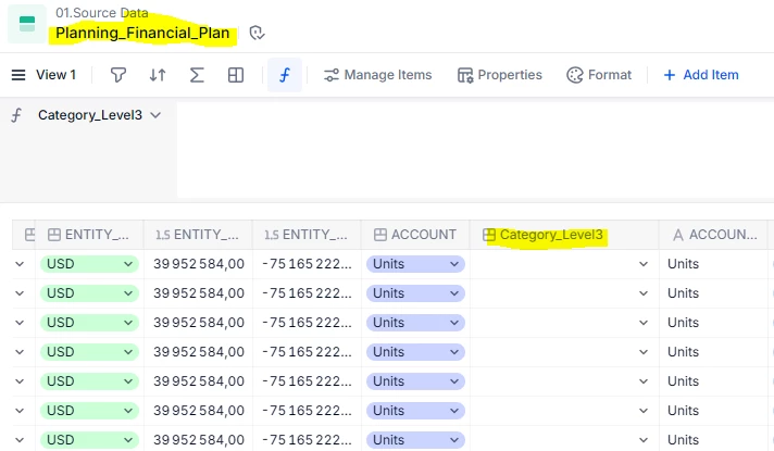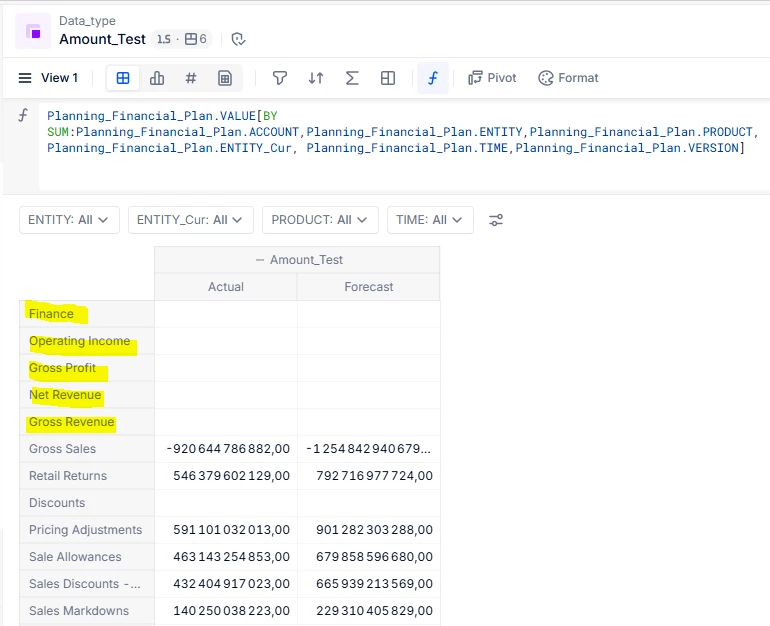 Problem: When I create my metric, the rows (Finance, Operating Income, Gross Profit, Net Income, Gross Income) are empty and do not aggregate with their children, and therefore do not allow for ratio and P&L calculations.