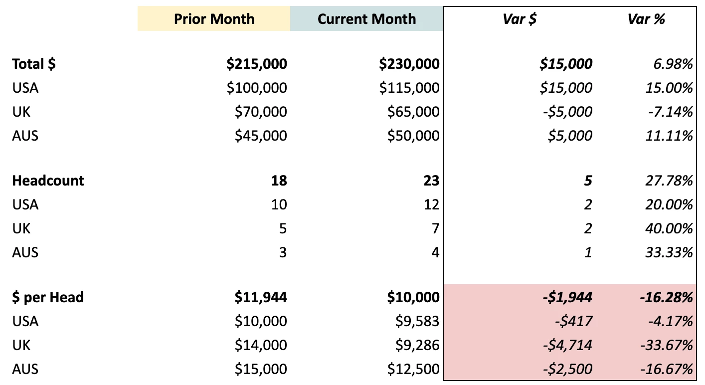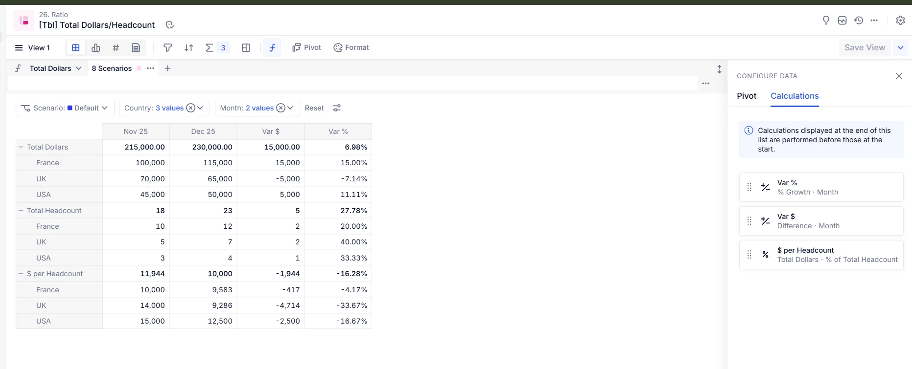 I am trying to recreate a table like this in Pigment where the scenario would be Actuals and Var $ and Var % are calculated items and $ per head is ‘Total $’ in ‘Show Values as % of’ format. In Pigment, the red cells end up calculating as a % of as well instead of a variance. Does anyone know of a work around for this? If I make an independent $ per head metric the total $ per head line will be inaccurate. Thank you!