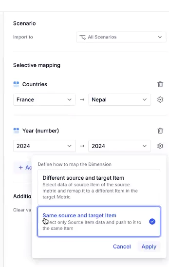 - in addition to importing data from one Scenario to another inside the same Metric, we should also be able to import data between 2 different Metrics, if they have the same dimension and data type.
