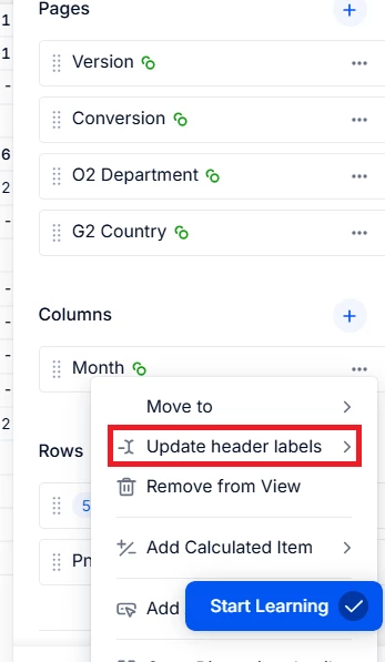 When I place a dimension on a row or a column, I can choose to show either the code (name) or the Display Name by using the “Update header labels” feature, which works perfectly.