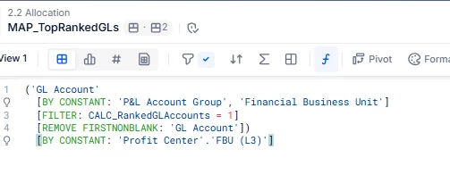 I'm trying to use a number-metric in which I have ranked all GL accounts as a mapping metric. I would like to allocate planned costs on level 2 to level 1 based on the top ranked L1 within each L2.