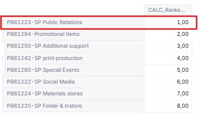 My ranking metric produces this output. Based on this, I would like to allocate the costs that are planned on a higher level to PB61223.