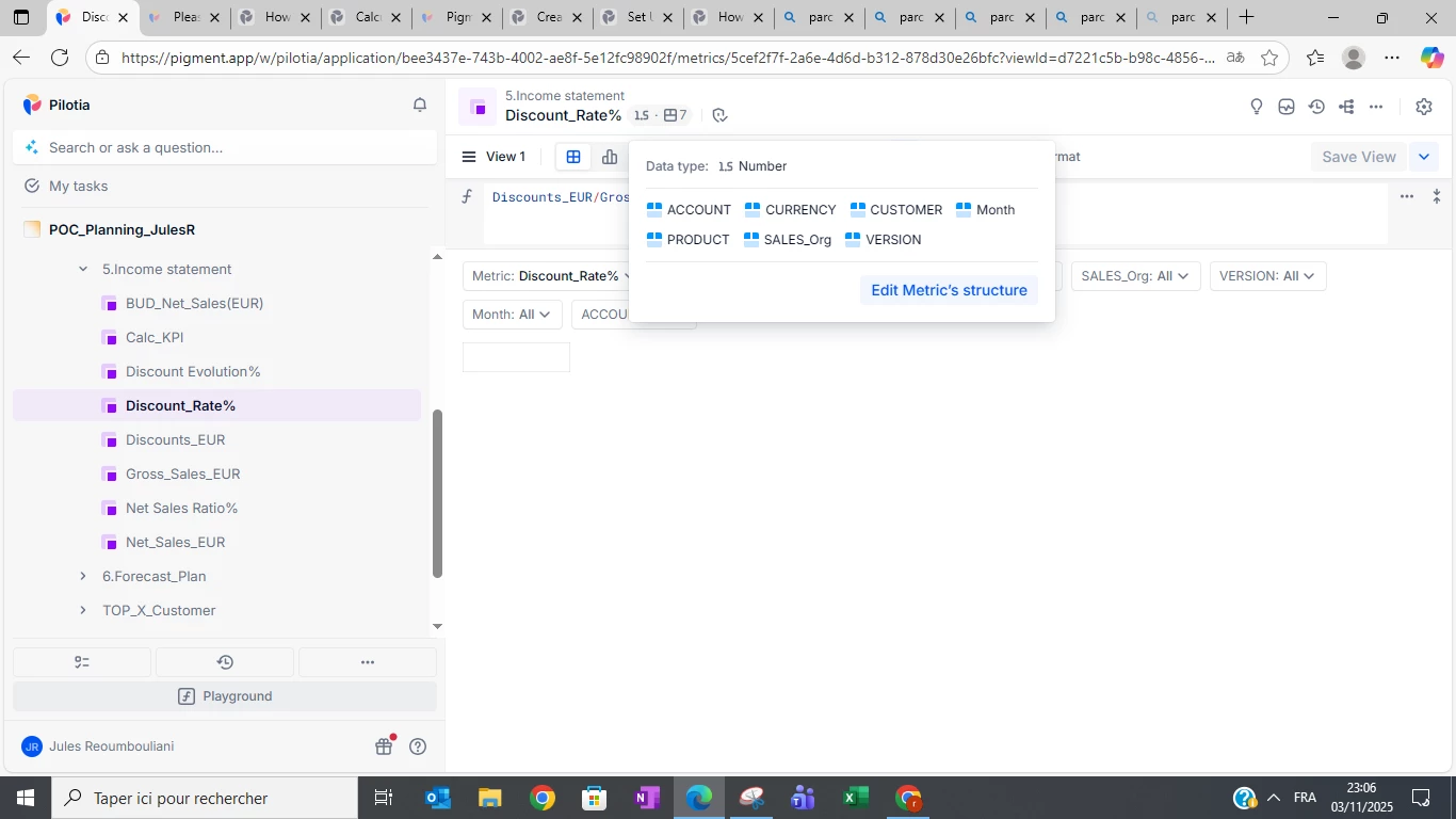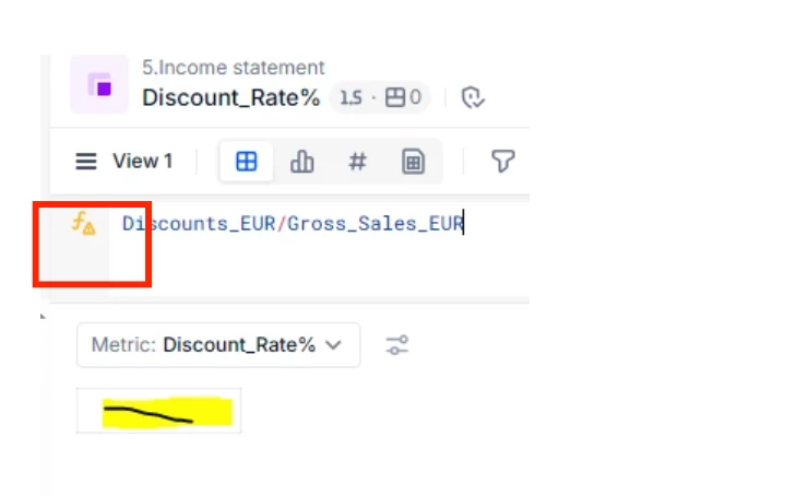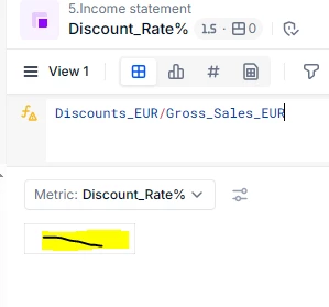 I would like to divide my 'Discount_EUR' metric by my 'Gross Sales EUR' metric, but I'm not getting any value. Can you help me solve this problem? Thank you in advance.