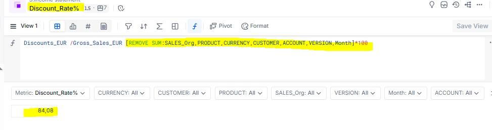 Now you have 7 dimensions in your final metric. In your metric of Discount_EUR, I noticed that the customer dimension is not included from your previous screenshot.