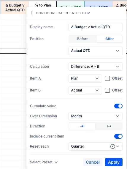 “Variance” type – calculated as the difference or percentage change versus the selected comparison scenario