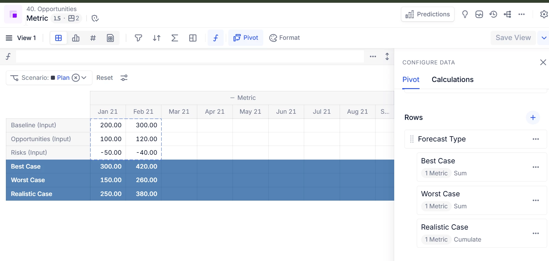 Does anybody know if it is possible to use scenario's as an incremental effect to the default scenario? For my use case: I have a default scenario where my users are inputting their baseline forecast for the coming months/ years. I would like for them to be able to also model the associated risks & opportunities as incremental effects to that baseline forecast. So, basically: default scenario + opportunities = best case scenario. And; default scenario + risks = worst case scenario. And: default scenario + opportunities + risks = realistic scenario.