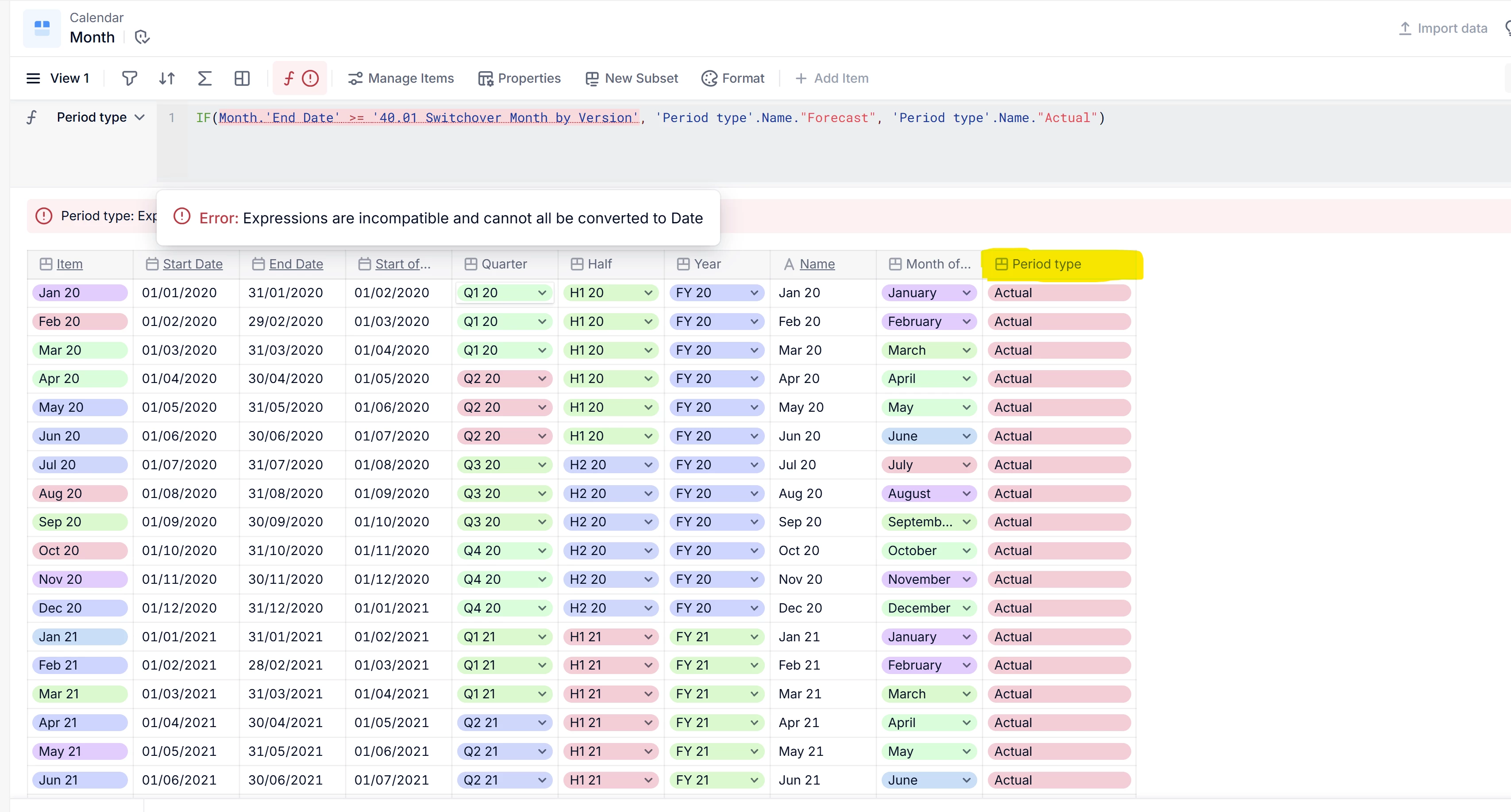 We have added versions to our switchover date/month metric to be able to distinguish different switchover periods for each version. However, the period type property is now generating errors. Im unable to change the formula or delete the property. We have created an alternative mapping for period type in a dedicated mapping metric for each time dimension as the list property doesnt allow for this.