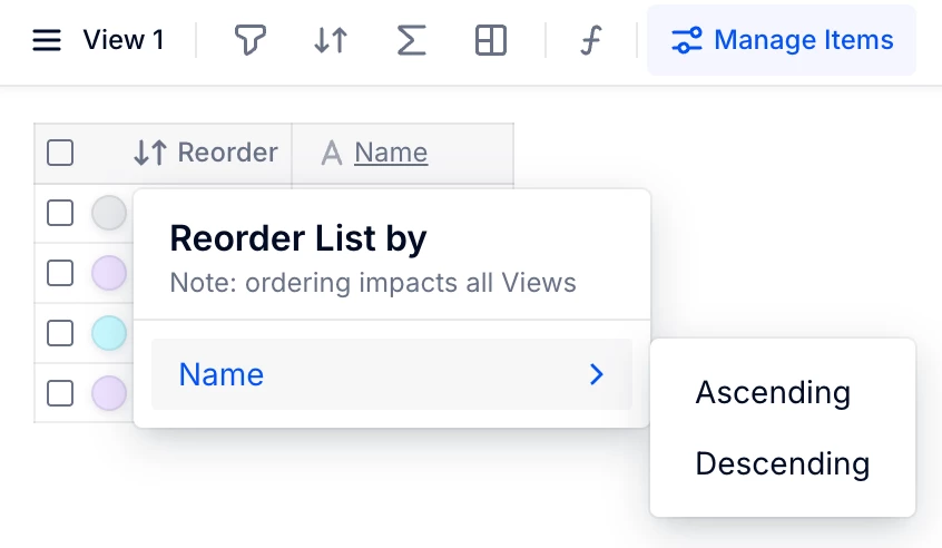 Hi @ljanowski in order to reorder your list faster, after clicking on “Manage Items”, you can directly click on the “Reorder” button in the list header.