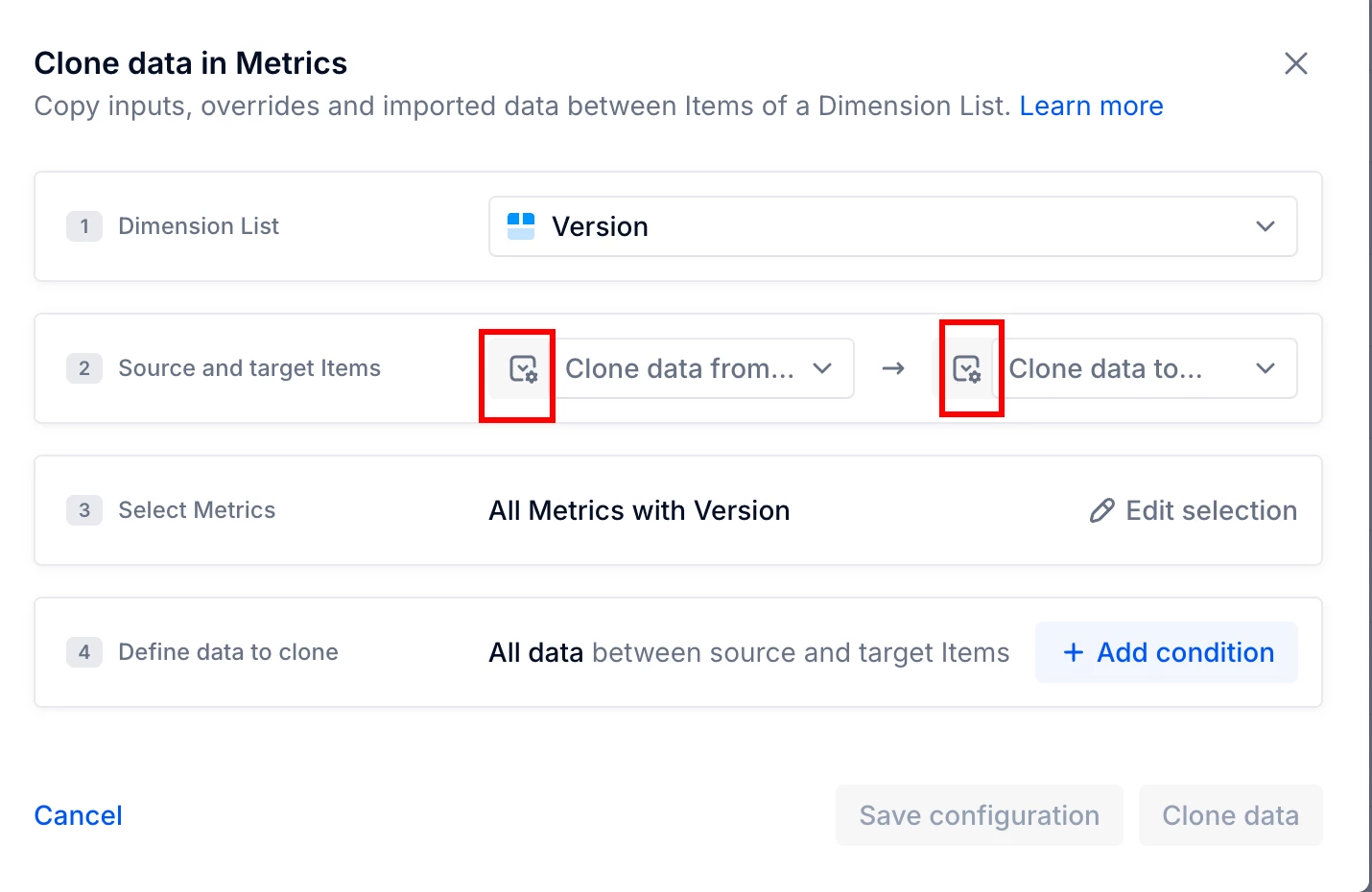 The Clone data in Metrics dialog steps
