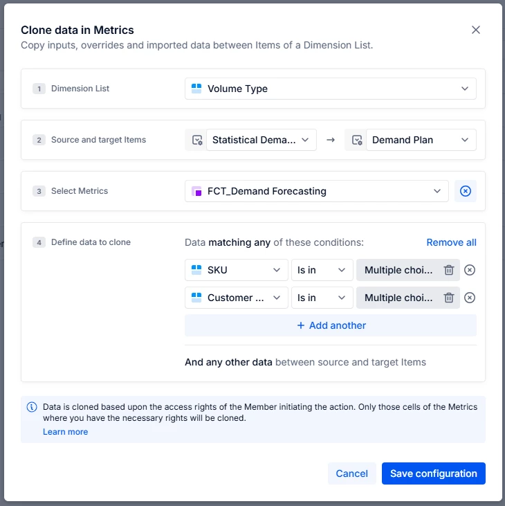 I am trying to give users the ability to initialise data from a statistically generated demand plan using Clone data in metrics. I am using the following set-up, and the clone appears to run, but no data is created in the metric and application history shows no values were moved.