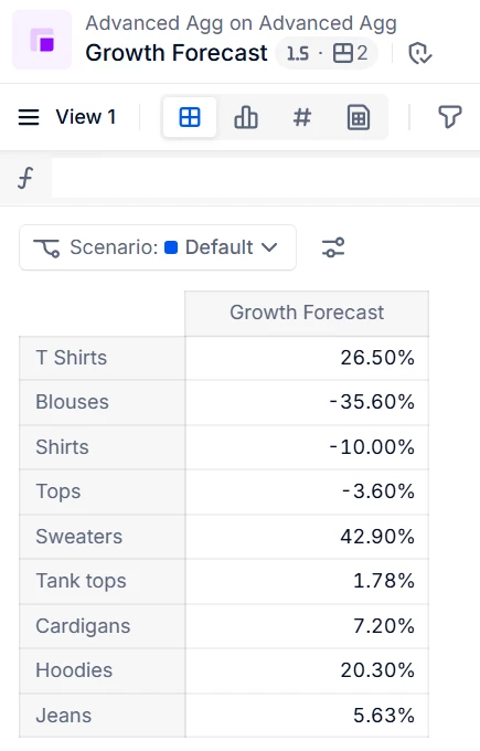 Create a Metric called Growth Forecast with Number data type. Its Dimensions are Product line and Year.