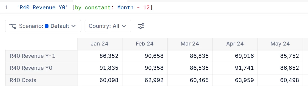 Duplicate it and rename the copyR40 Revenue Y-1. Add a formula such as'Revenue Y0' [BY CONSTANT: Month - 12]to become your Metric of revenues for last year, changing input values as desired.