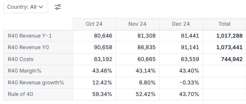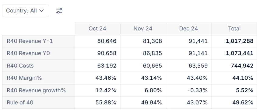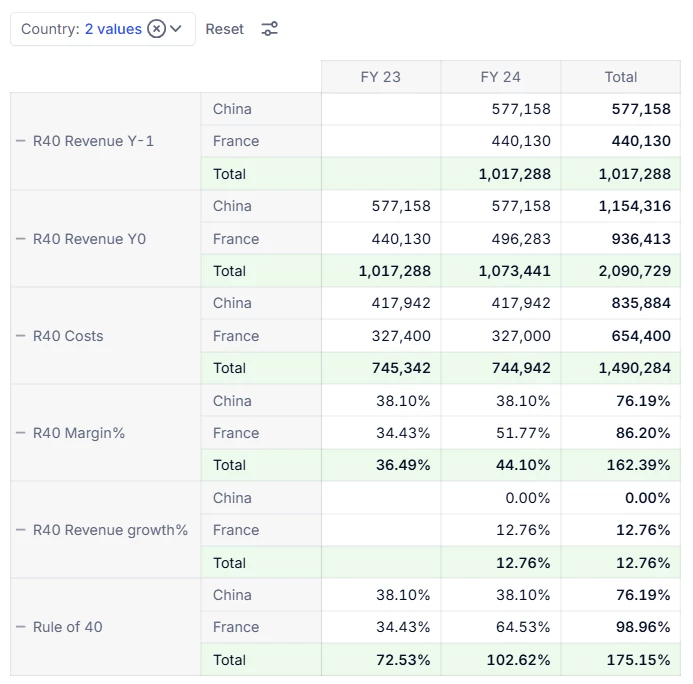 Notice that with ‘All’ countries selected in the Page selector, theMargin%andRevenue growth%are showing the sum of ratios, which is not meaningful. As a result theRule of 40measure is also not meaningful.