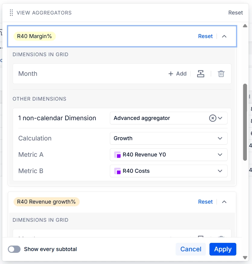 Under DIMENSIONS IN GRID > Month, select Advanced aggregator from the drop-down.