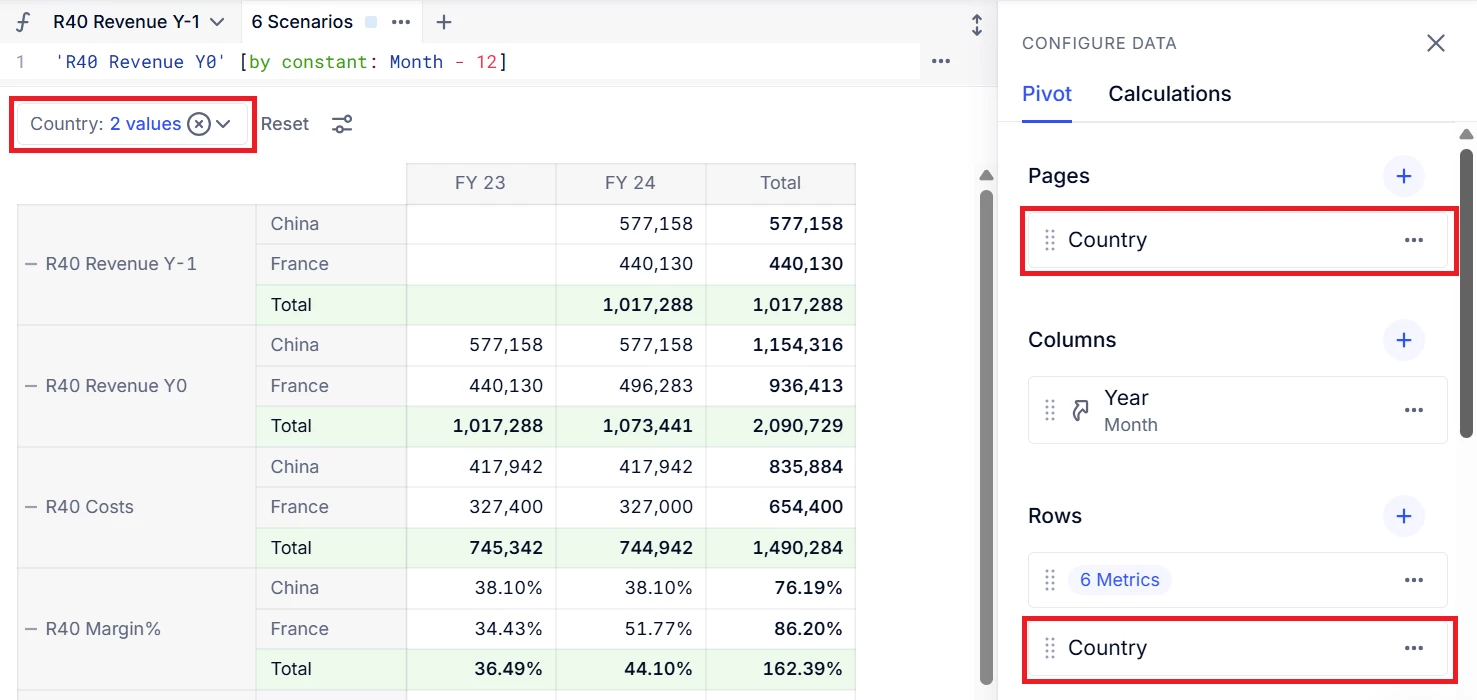 In the 𝝨 menu, for Revenue Y-1, Revenue Y0 and Costs, select Sum aggregators in the Month and Country Dimensions.
