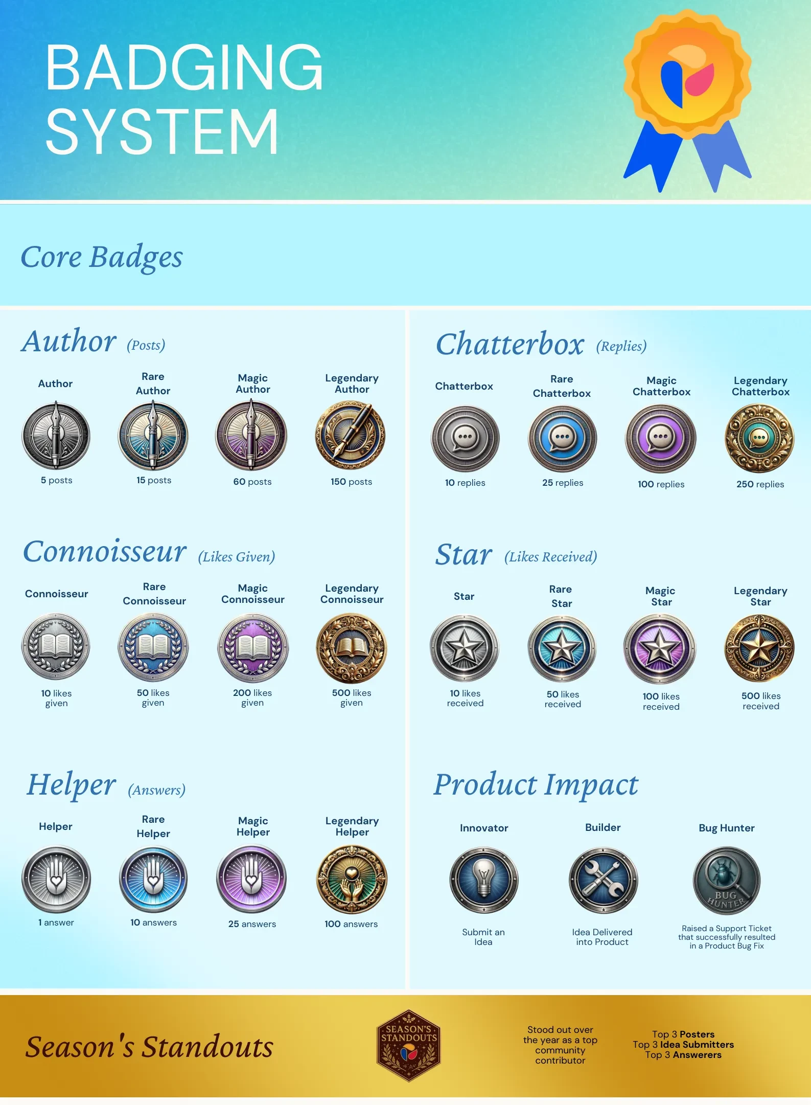 Together, these badges celebrate both consistent engagement and standout contributions across the community.