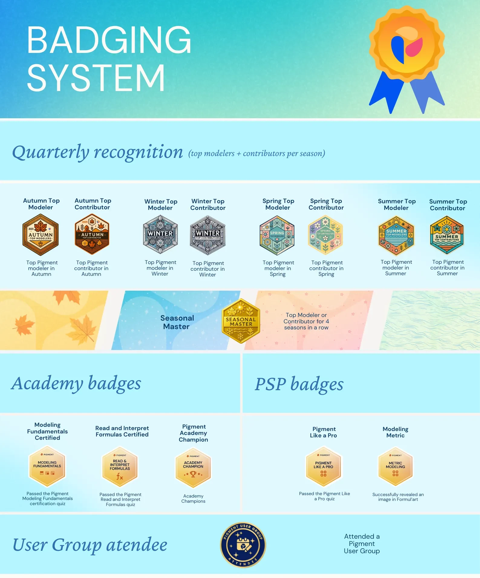 - Academy Badges: earned through learning in the Academy. Modeling Fundamentals Certified rewards passing the Pigment Modeling Fundamentals certification quiz, Read and Interpret Formulas Certified rewards passing the Pigment Read and Interpret Formulas quiz, and Pigment Academy Champion rewards the Top 10 academy learners each month.